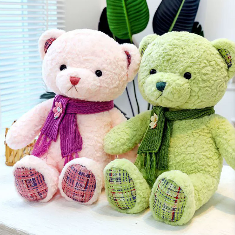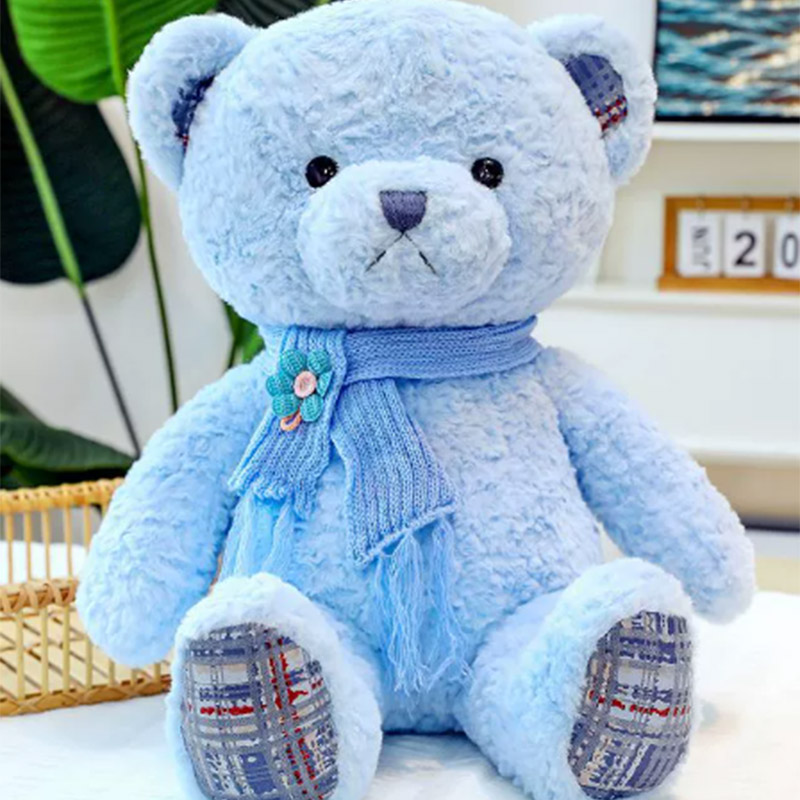 Debjörnplyscheksakär gjord av rullat plyschtyg, som är mer känsligt och smidigt. Den är fylld med PP -bomull inuti, och en halsduk av samma färg bärs runt halsen, dekorerad med blommor för att ge kul.