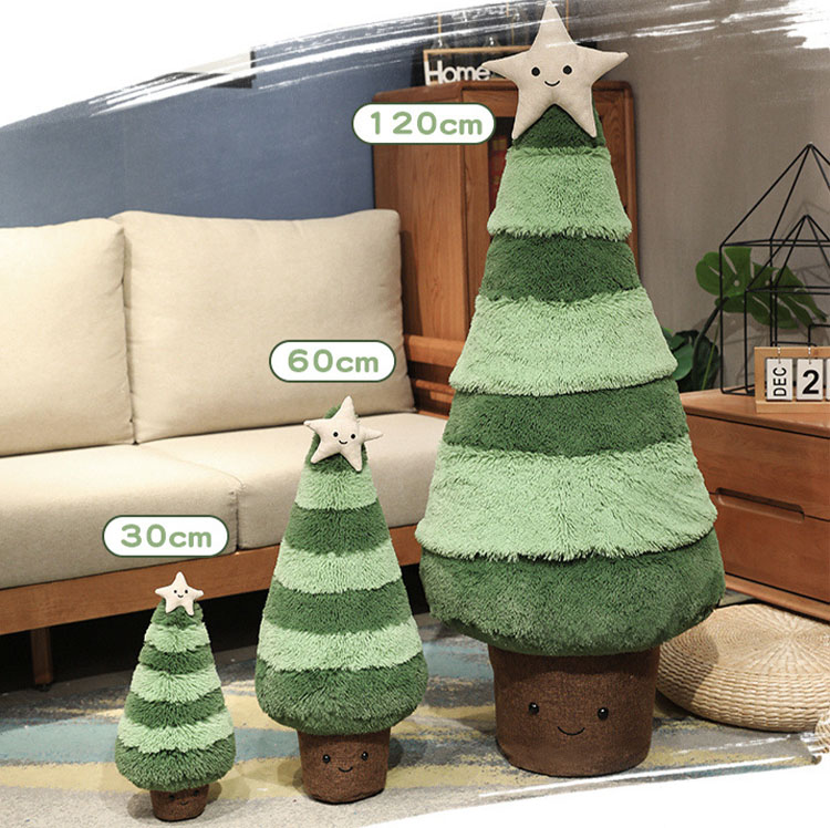 Denna julgran plyschleksak är en bästsäljare till jul. Den finns i fyra stilar och tre leksakstorlekar: 30 cm, 60 cm och 120 cm. Storleken på julgranen kan väljas efter behov. Det kan placeras i olika positioner. Till exempel kan en 30 cm en placeras på en bil eller på ett fönster. En större kan placeras i vardagsrummet som en semesterdekoration. Vissa små ornament kan också dekoreras på julgranen, vilket är mycket festligt.