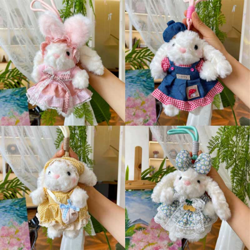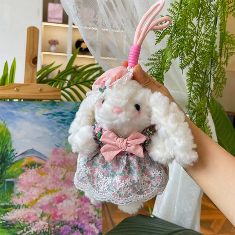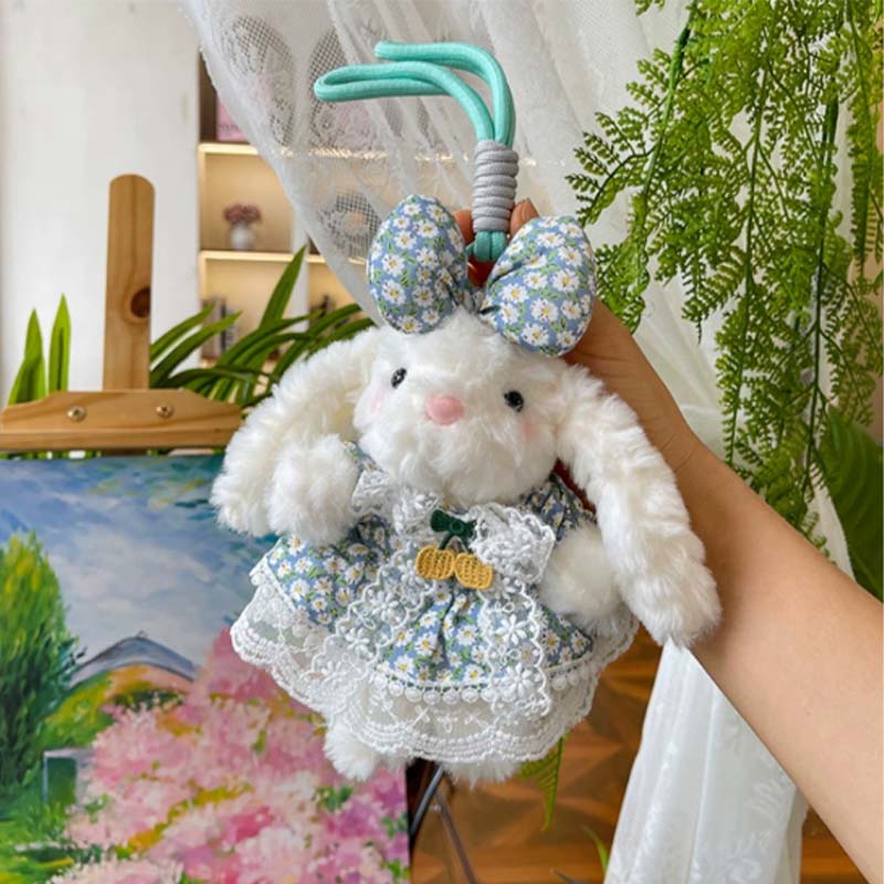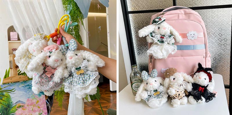 Bland dessa små kaniner har vissa små klänningar, vissa bär små förkläden och andra bär små halsdukar. Deras kläder kan bytas fram och tillbaka. Du kan göra din egen DIY för detta hänge och skapa din egen matchande stil. Deras kläder är mycket utsökta, med spetsdekorationer, och de är extremt vackra. Dessutom har de små kaninerna också tillbehör: fjärilsblommor och en liten hatt. Vissa har till och med en påse fäst.