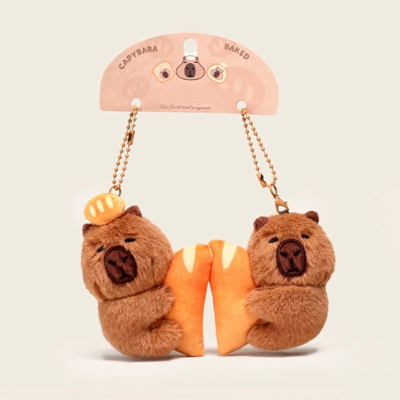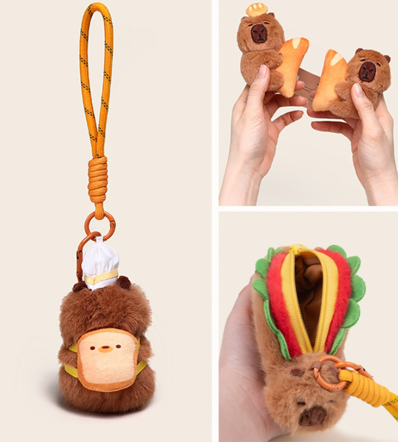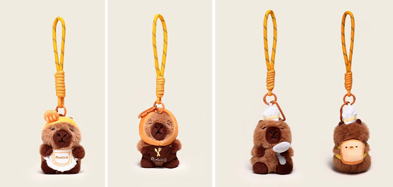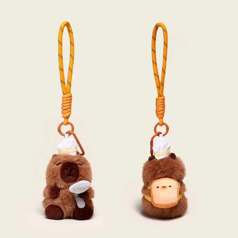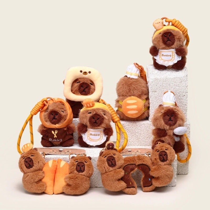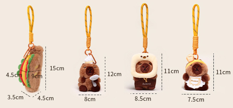 Denna plysch nyckelringar är utformade baserat på prototypen av en "capybara". Denna serie har många stilar. Den övergripande stilen är söt. De ser ut precis som i ett bageri eller en bakrum, vilket är mycket intressant. Capybara är varmt brunt utseende, modelleringen är väldigt fruktig, uttrycket är väldigt rikt, ser väldigt söt ut. Några av dem är dekorerade med brödrelaterade ornament: capybaras med rostat bröd på huvudet, capybaras med bröd på ryggen, capybaras med kockhattar på huvudet och capybaras med förkläden runt deras kroppar. De är precis som små kockar i ett bageri. Vissa capybaras är utformade för att hålla bröd eller interagera med det. Varje blick är väldigt söt.