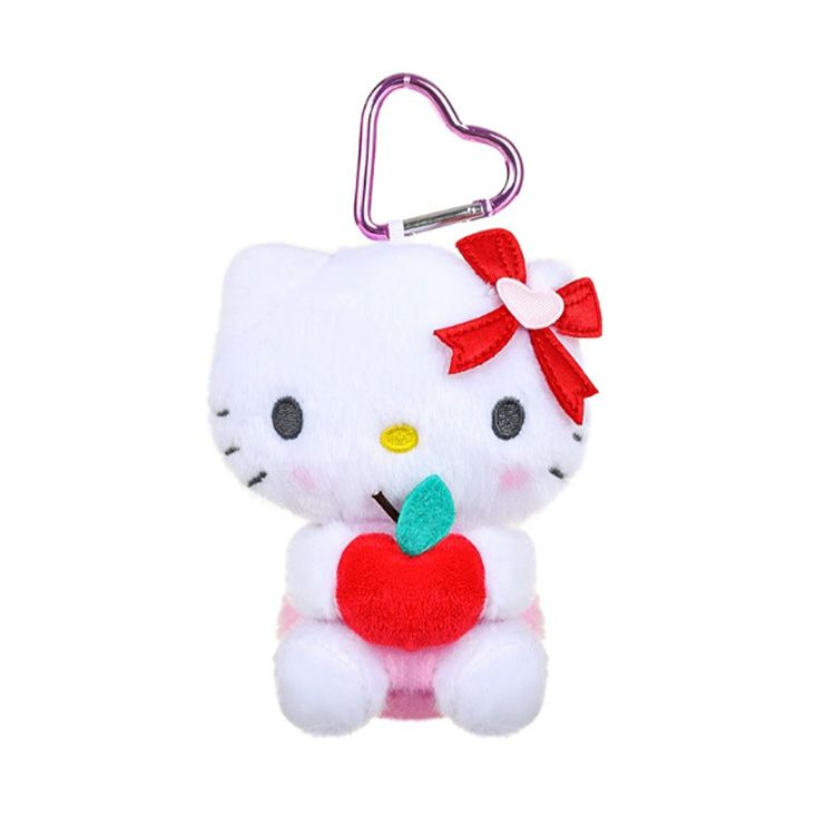 Hello Kitty: Hello Kitty är helt vit. Den bär en rosa klänning och håller ett stort rött äpple i armarna. Dess uttryck är mycket känsliga och alla sys med tråd.
