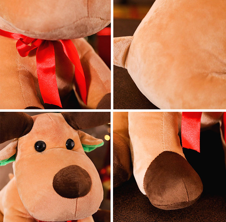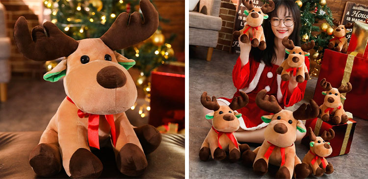 Denna ren plyschleksak har en mycket varm ljusbrun färg. Paret av bruna gevir på huvudet är väldigt söta och överdrivna. Dess runda svarta ögon, mörkbruna näsa och de gröna accenterna inuti öronen ger den ett elegant och tredimensionellt utseende. Den ljusröda bågen som är bunden runt halsen bidrar till den festliga atmosfären. Det mjuka utseendet på denna lilla hjort gör att man omedelbart känner sig glad under semestern, som om det kan ge dig en gåva när som helst.